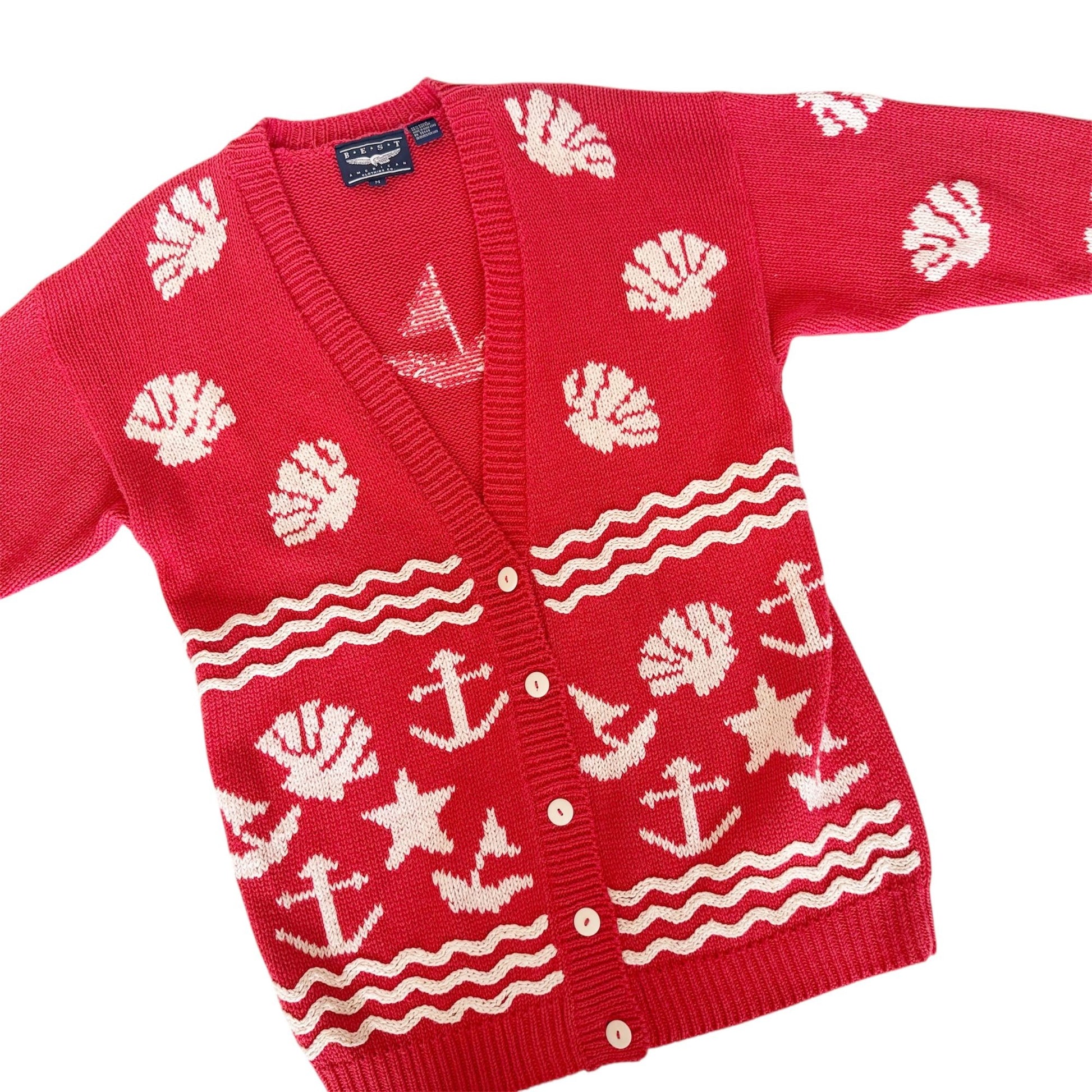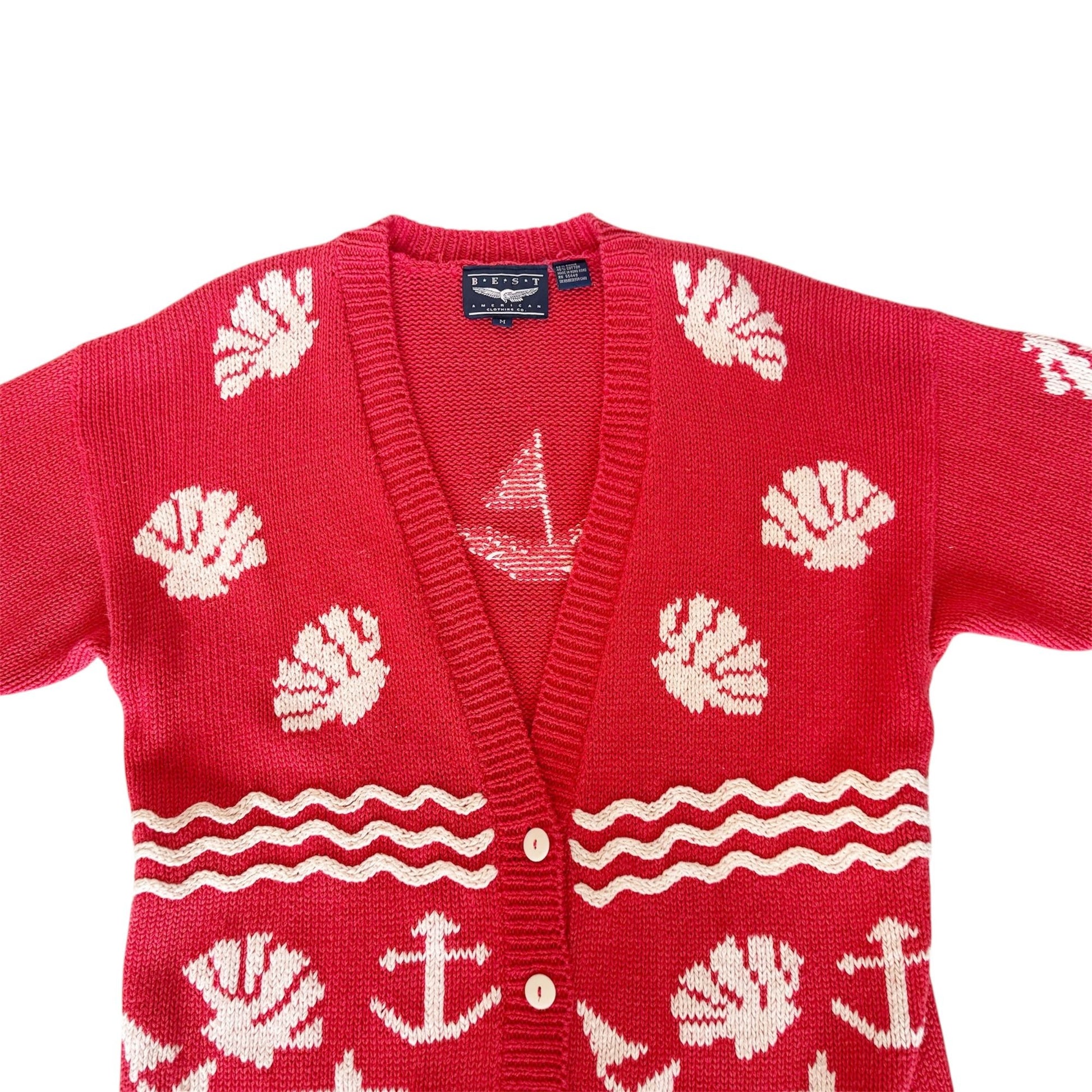 Great Vintage cardigan sweater by Best American Clothing Co. Circa 1980s / 1990s. Coral and white. Nautical themed. Open knit. Oversized with 5 button closure. 55% mamie, 45% cotton. Size medium. Pre-owned and gently worn in really nice condition!